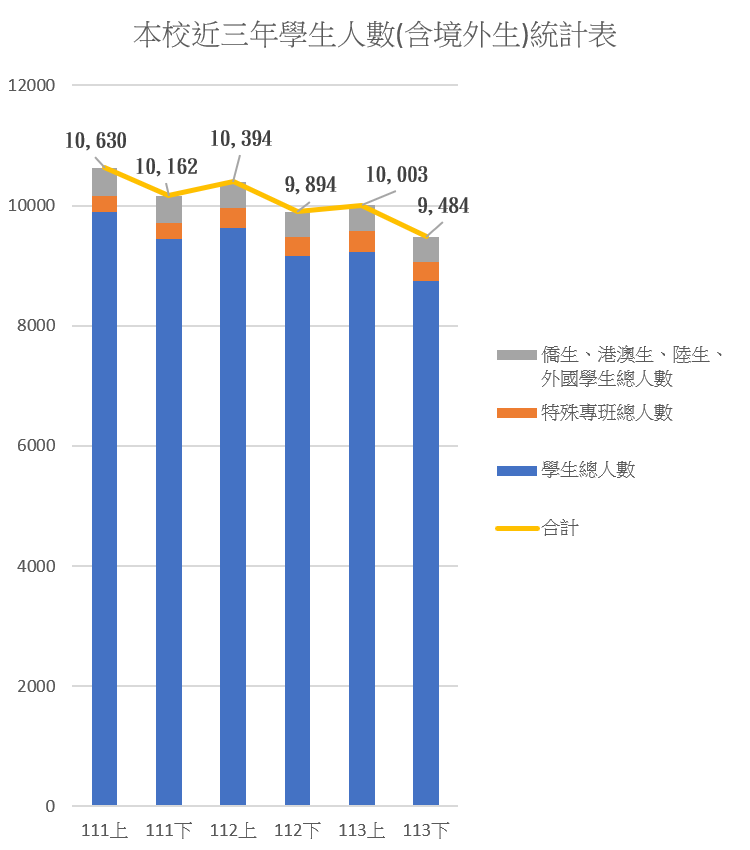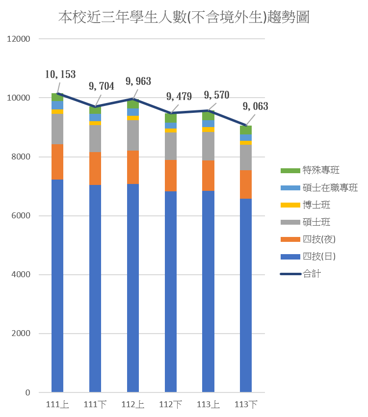 合計 | 10,687 | 10,630 | 10,394 | 學士班(日間) | 7,640 | 7,627 | 7,562 |